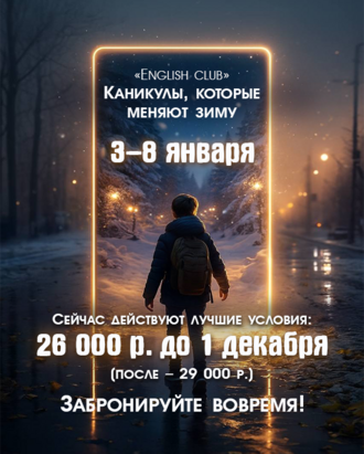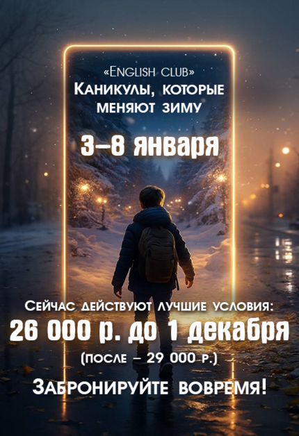 До 1 декабря успейте приобрести путёвку на рождественскую смену всего за 26 000 ₽ вместо 29 000 ₽.